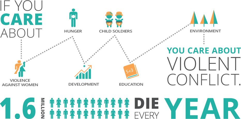 Violent conflict means physical and sexual violence, but it also includes verbal abuse, bullying and systematic discrimination. Violent conflict is a root cause of hunger, poverty, low education and poor healthcare. It disrupts trade for decades and destroys the environment.