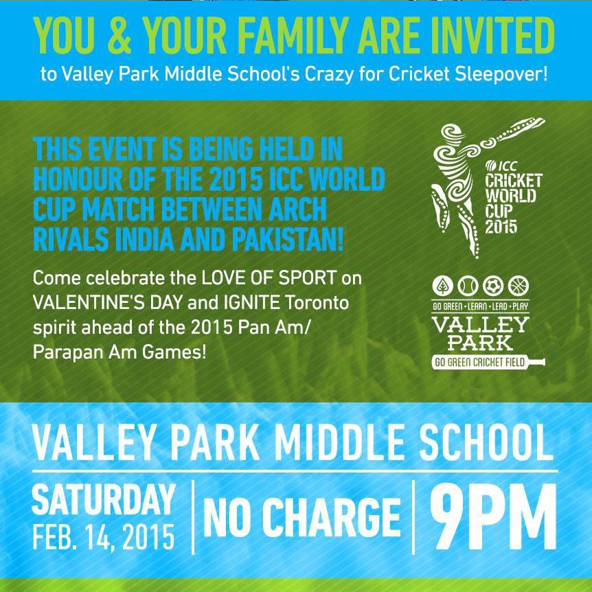 (Feb 13, 2015)- The Valley Park Go Green Cricket Field Project will be hosting its second Crazy for Cricket Sleepover Event on Saturday at Valley Park Middle School (VPMS) in honor of the 2015 ICC World Cup Match between arch rivals India and Pakistan!