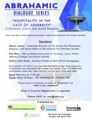 The Christian Jewish Dialogue of Toronto, Toronto Board of Rabbis, Tessellate Institute, The Centre for Philosophy, Religion and Social Ethic, and the Intercultural Dialogue Institute are jointly organizing the 3-part series of dialogues.