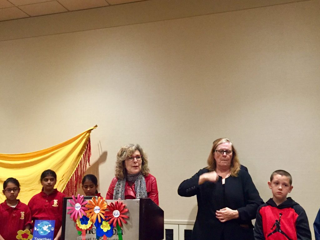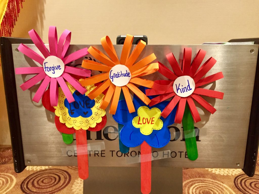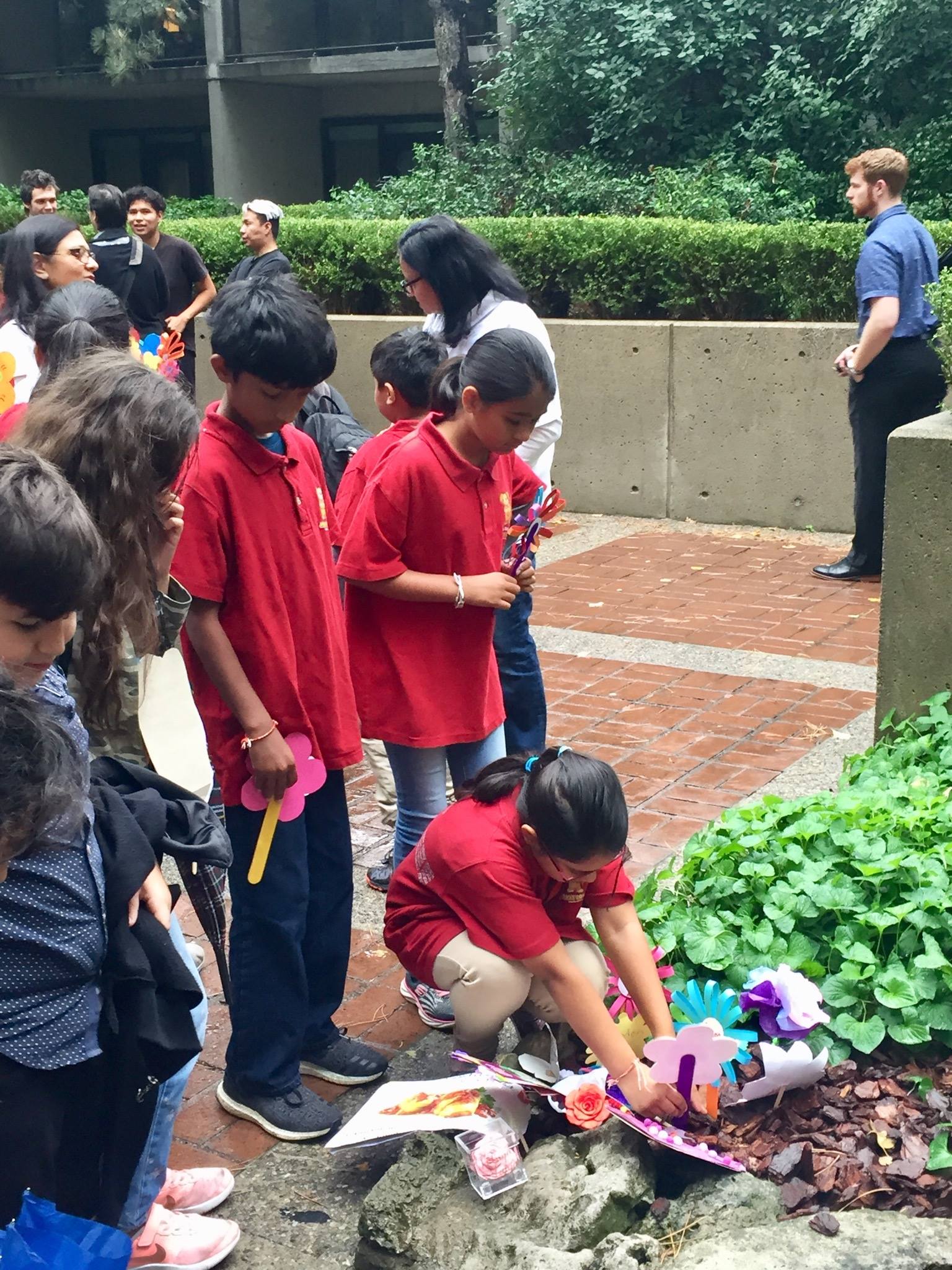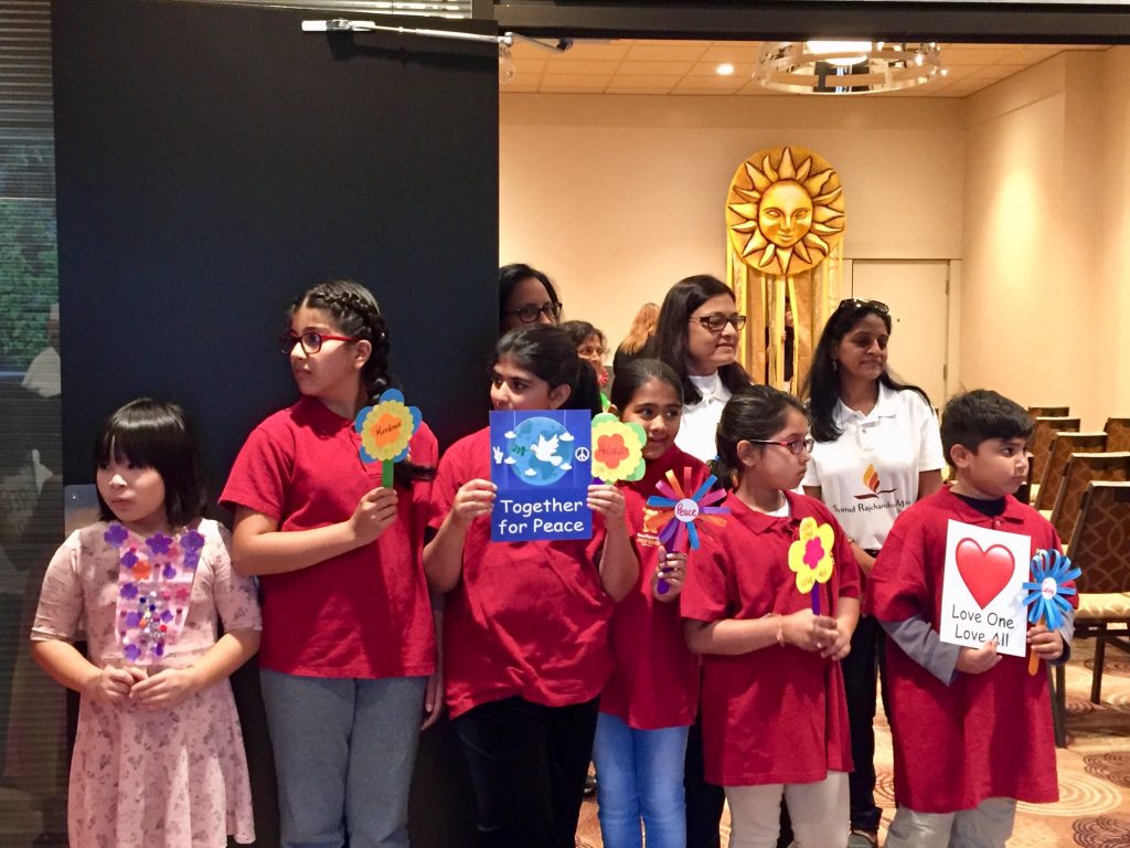 The event themed, “Kids Plant Seeds of Peace with the Parliament of the World’s Religions” brought together children who hosted a symbolic “planting”, placing flowers in the garden that were designed and created by them. Their art pieces included a thought from each child about peace, friendship, inclusion or love, and what it means to them.
