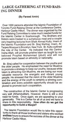 By 1985, the Islamic Foundation of Toronto was at a pivotal stage in its development – funds needed to be raised to build the new Islamic Centre and the same sense of community that was among the membership at the Rhodes Avenue mosque needed to be developed among the rapidly growing Muslim community that became affiliated with the organization as a result of the new project.