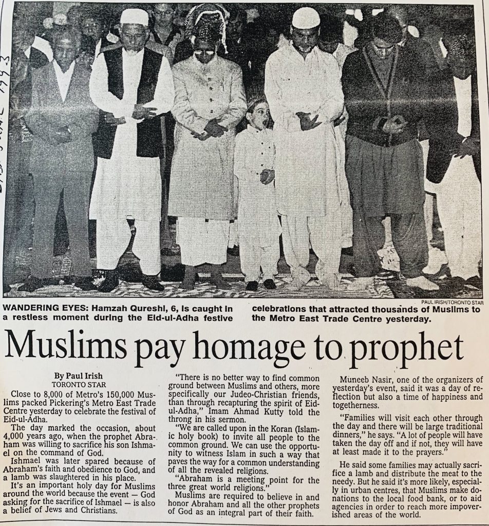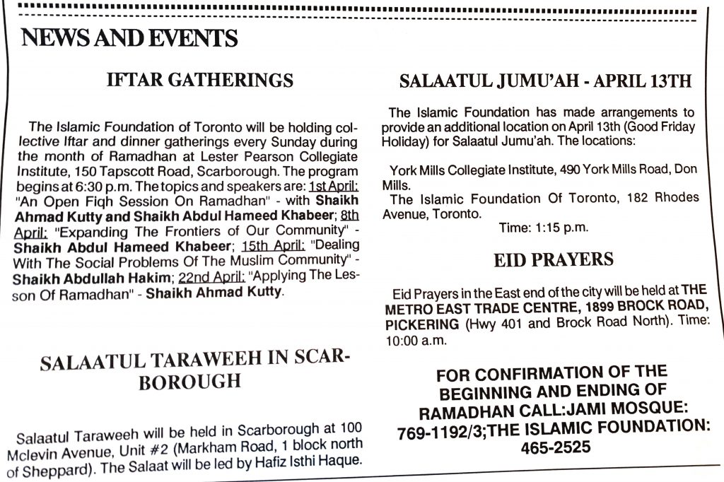 As the 1980s came to a close, the organization was holding Salaatul Taraweeh prayers during Ramadan at 100 Mclevin Avenue that was located a block away from the site of the new Centre. They also moved the weekly Ramadan Iftar dinners to Lester Pearson Collegiate Institute in Scarborough and these gatherings attracted hundreds of people. Eid prayers were now being held at the Metro East Trade Centre in Pickering and drew in excess of 8,000 people.