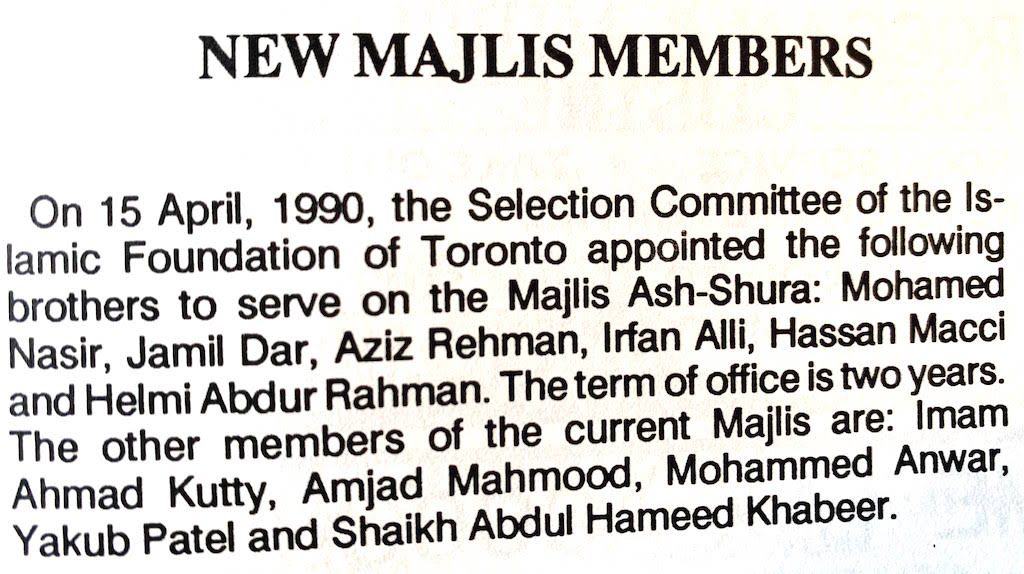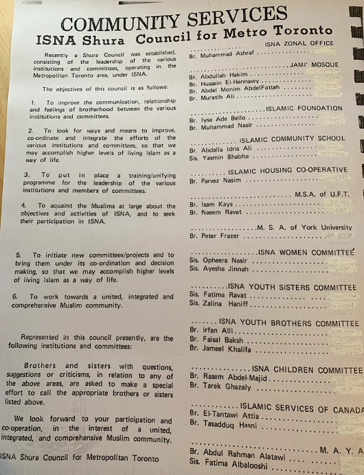 In early 1986, a ISNA Shura Council of Metro Toronto was formed that brought together the Islamic Foundation of Toronto, Jami Mosque, Muslim Student Associations on university campuses, and women and youth groups into an umbrella coordinating council.
