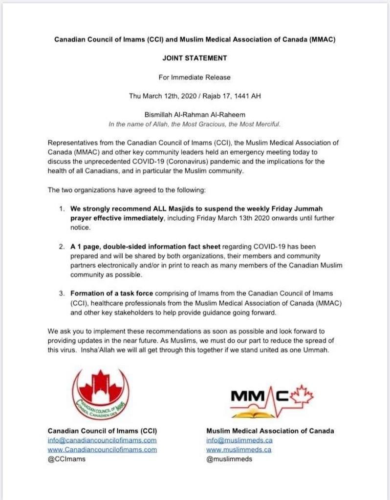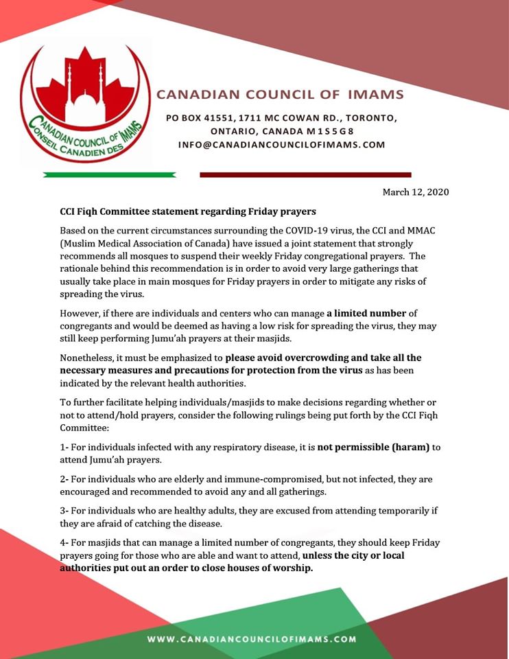 The Canadian Council of Imams is recommending that mosques suspend the congregational Friday prayer services effectively immediately in response to the COVID-19 pandemic.