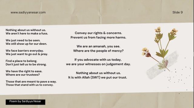 “Allah did not leave us behind - He is giving everyone the chance to fulfil Amanah towards us,” was the message delivered by Sa’diyya Nesar, Hong Kong based disability advocate, to the 2nd Annual Global Conference on Disability and Islam held online on Saturday, September 25th.