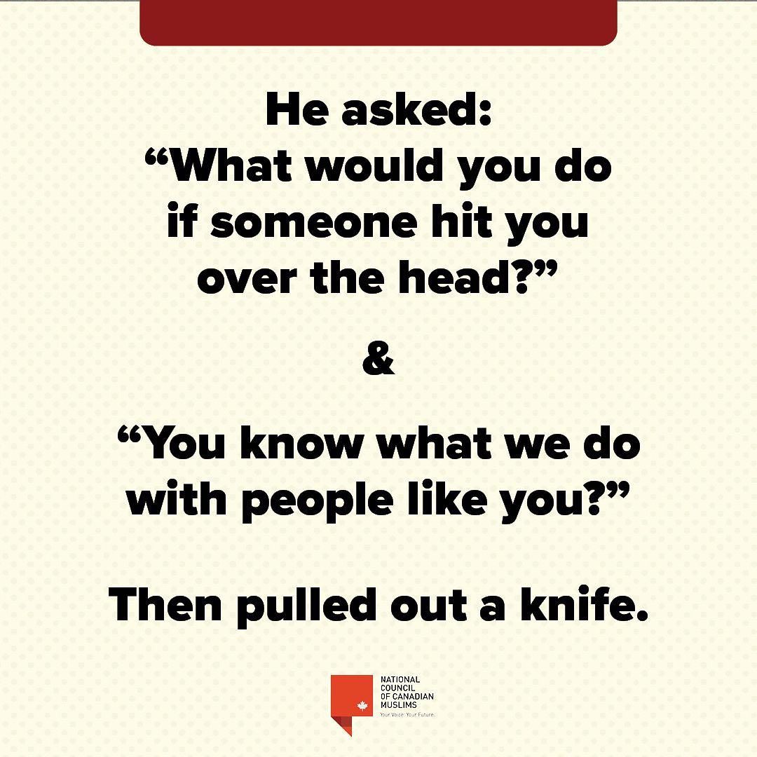 He then asked, "What would you do if someone hit you over the head?" and "You know what we do with people like you?"And pulled out a large knife from his backpack and started approaching the young Muslim woman.