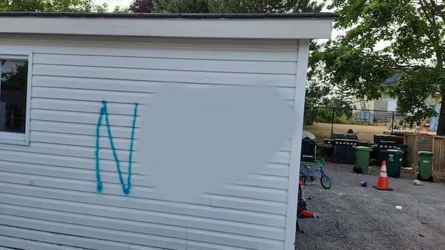 Photos taken the next day show the N-word written on the building in thin blue letters.