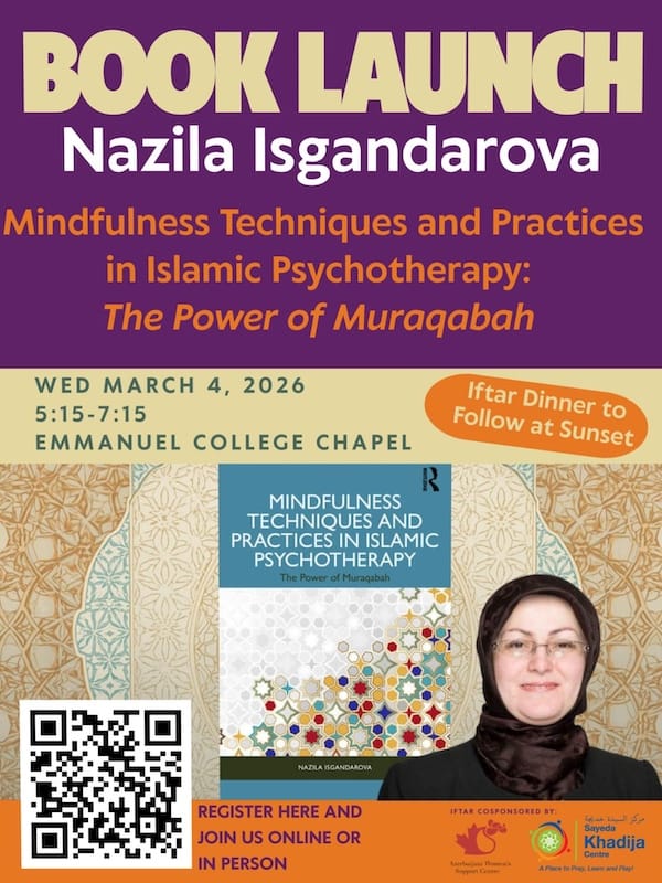 Book Launch: https://emmanuel.utoronto.ca/whats-happening/mindfulness-techniques-and-practices-in-islamic-psychotherapy-the-pow